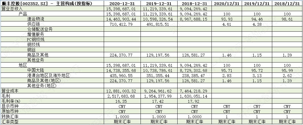 (1) 顺丰控股[002352.SZ]是国内领先的快递物流综合服务商,经过多年发展,已初步建立为客户提供一体化综合物流解决方案的能力,不仅提供配送端的高质量物流服务,还延伸至价值链前端的产、供、销、配等环节,以消费者需求出发,利用大数据分析和云计算技术,为客户提供仓储管理、销售预测、大数据分析、金融管理等一揽子解决方案。公司的物流产品主要包含:时效快递、经济快递、同城配送、仓储服务、国际快递等多种快递服务,物流普运、重货快运等快运服务,以及为生鲜、食品和医药领域的客户提供冷链运输服务。