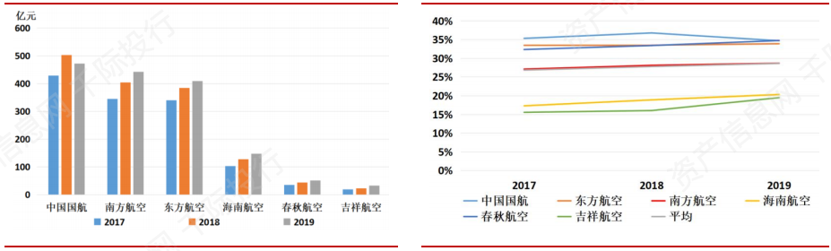 2017-2019年,6家航司的境外收入占比平均值为26.8%、27.8%和28.6%。三大航空公司中,中国国航和南方航空境外收入大于东方航空;国航和东航的境外收入占比高于南航。2017-2019年,国航的境外收入平均占比为35.6%,东航为33.6%,南航为27.9%,三大航境外收入占比均较稳定。