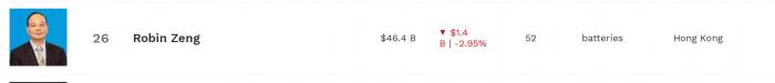福布斯官网称,榜单的数据根据股票市场的变化每隔五分钟进行更新。曾毓群的财富来自其所持有的宁德时代股权,他间接持有该公司24.53%的股份,为宁德时代的实际控制人之一。宁德时代的主营业务为新能源汽车所使用的动力电池。2020年宁德时代营收为503亿元,净利润接近56亿元。