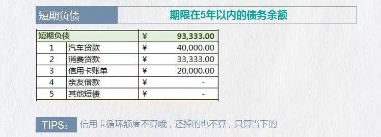 需要说明的是,由于身家表是个静态概念,所以我们制表时的债务余额是多少就填多少。