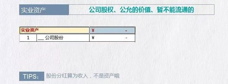 举个例子,你投资一家餐厅100万,每年分红10万,资产这里则应填100万,分红的10万应填在另一张表,即创富表中的收入栏。