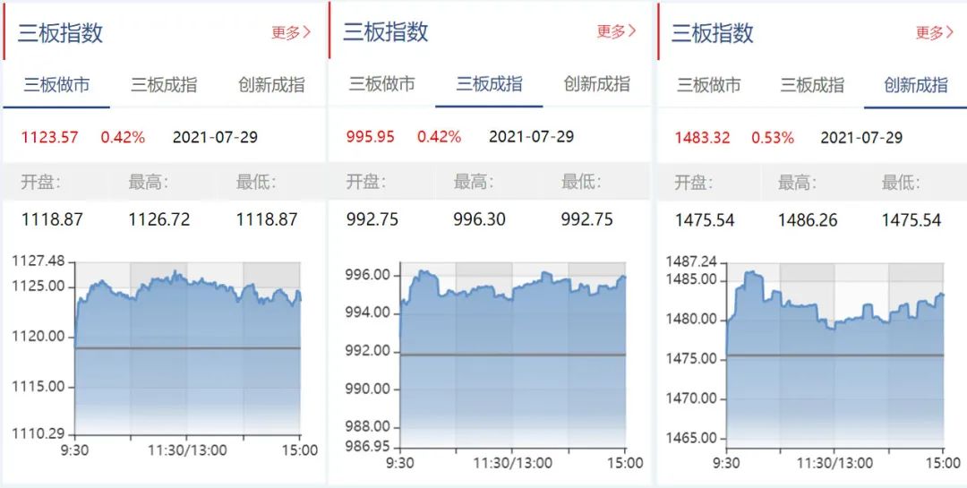 截至7月29日收盘,三板做市报1123.57点,上涨0.42%;三板成指报995.95点,上涨0.42%;三板创新报1483.32点,上涨0.53%。