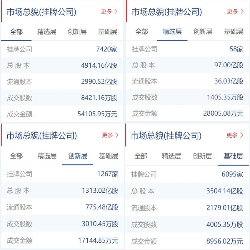 新三板挂牌公司总计7420家(精选层58家,创新层1267家,基础层6095家),总股本4914.16亿股,流通股本2990.52亿股。