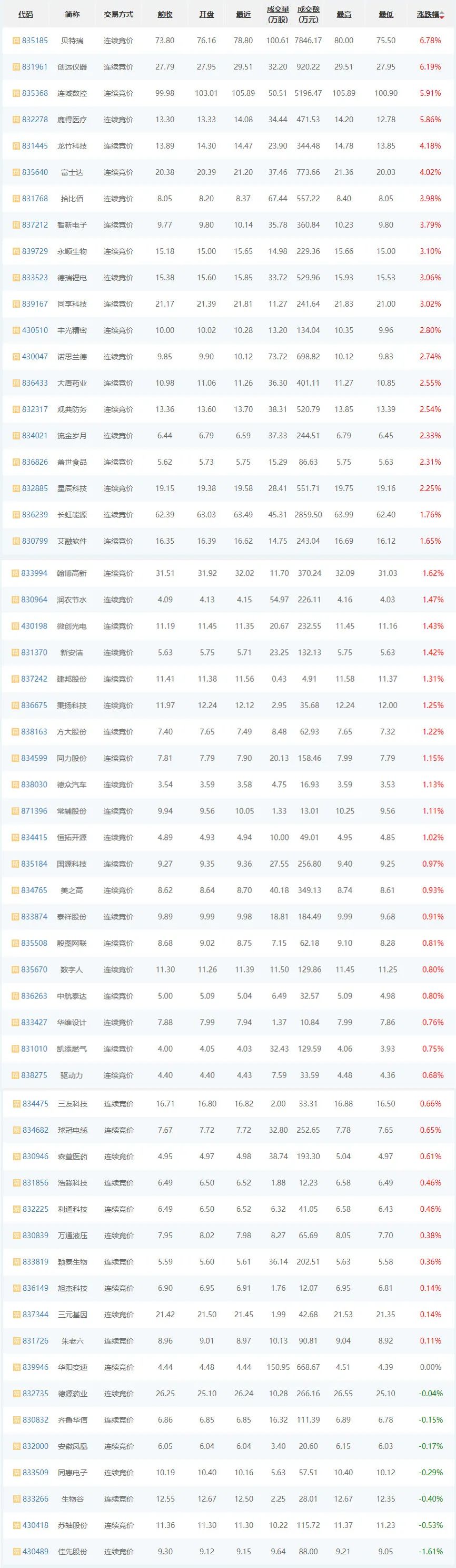 7月29日,精选层普涨,50家企业上涨,1家平盘,7家下跌。其中,贝特瑞(835185)涨幅居首,上涨6.78%;其次,创远仪器(831961)上涨6.19%;佳先股份(430489)跌幅居首,下跌1.61%;苏轴股份(430418)居次下跌0.51%;华阳变速(839946)平盘。
