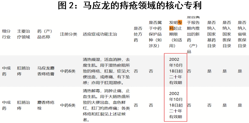 马应龙治疗痔疮的两个关键专利即将于2022年到期,届时公司400多年的配方将不再受专利保护,对上市公司可能会造成一定的影响,但是不会太大,因为制作工艺也是非常关键的,有药厂曾经拿到过马应龙痔疮膏的配方,但是一直仿制不出来。