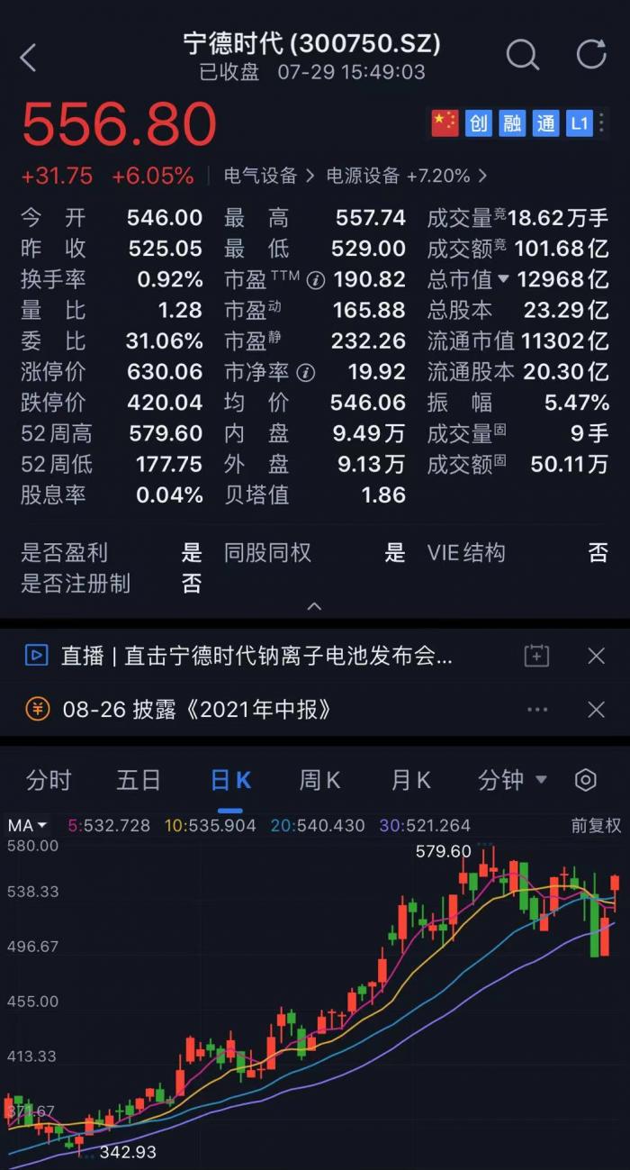 受此消息影响,宁德时代今日股价开盘逆势拉升,最高涨幅达到7.62%,截至收盘,股价上涨6.05%收报556.80元,总市值近1.3万亿元。