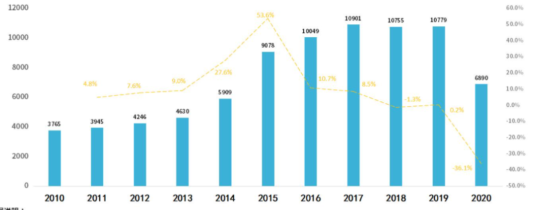 企查查数据显示,2015年开始,注册量出现较快增长趋势,当年一共新增9078家,同比增长53.6%。此后4年增长率陷入停滞,基本维持在1万家左右。2020年注册量仅为6890家,同比下降了36.1%。
