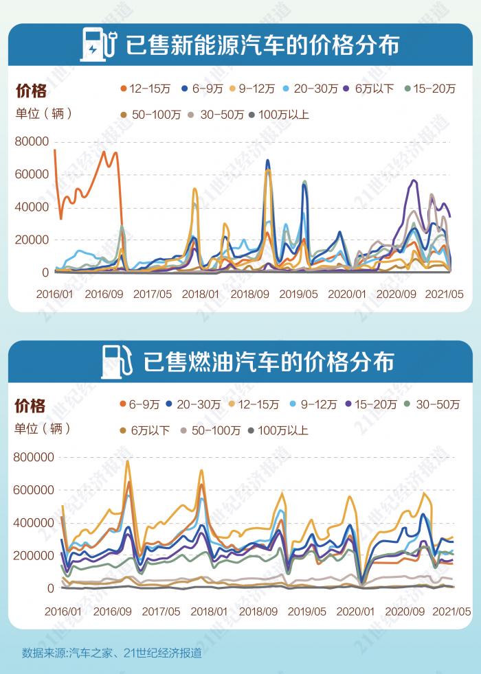 反观燃油车市场,超50%的已售燃油车价格区间在9-30万之间,其中定价12-15万的燃油车最受欢迎。即便是售价超50万的燃油车,销量也远高于6万元以下的平价车型。