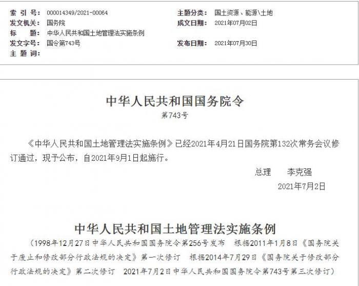 李克强签署第743号国务院令 公布修订后的《中华人民共和国土地管理法实施条例》