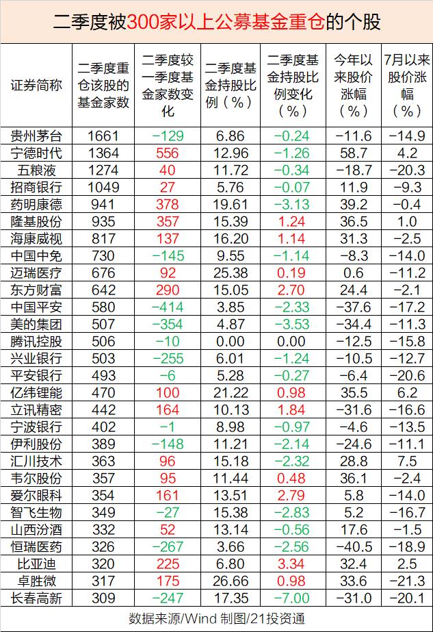 被300家基金重仓的28股中,基金二季度合计增持比例超过1%的个股有:比亚迪(002594.SZ)、爱尔眼科(300015.SZ)、东方财富(300059.SZ)、立讯精密(002475.SZ)、隆基股份(601012.SH)、海康威视(002415.SZ)。