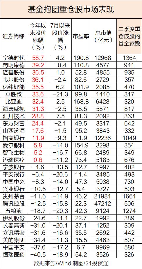 与此同时,被300家以上基金重仓的恒瑞医药(600276.SH)、中国平安(601318.SH)、美的集团(000333.SZ)、立讯精密(002475.SZ)、长春高新(000661.SZ)今年以来股价跌超30%。