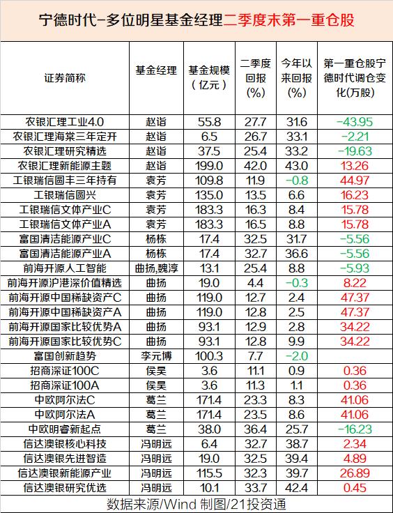 “宁组合”龙头股宁德时代二季度被1300多家基金重仓,较二季度增加556家,合计持股比例为12.96%,较一季度减少1.26%。其中,宁德时代是多位明星基金经理的第一大重仓股,其中袁芳、侯昊、冯明远、曲扬等二季度进行了增持,李元博等二季度新进为十大重仓股;赵诣旗下4只基金,3只减持宁德时代,1只增持;葛兰2只增持,1只减持;杨栋进行了减持。