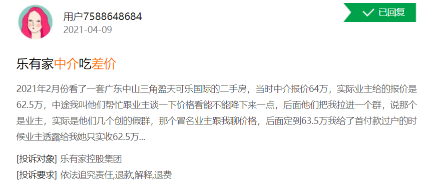 以乐有家为例,2021年4月9日,有消费者投诉称,中介报价64万,实际业主的报价是62.5万,也就意味着1.5万的差价被中介收入囊中。