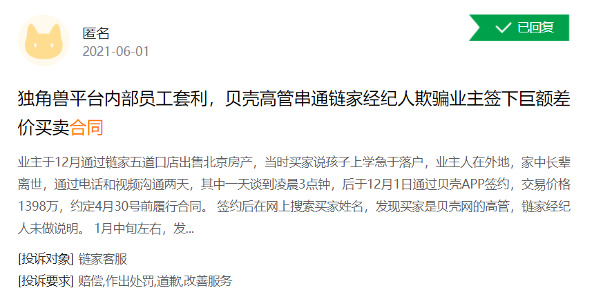 今年6月1日,有消费者在黑猫投诉上匿名投诉链家,投诉贴显示,业主被贝壳买家与链家联手欺诈交易,签下差价高达227万的买卖合同。