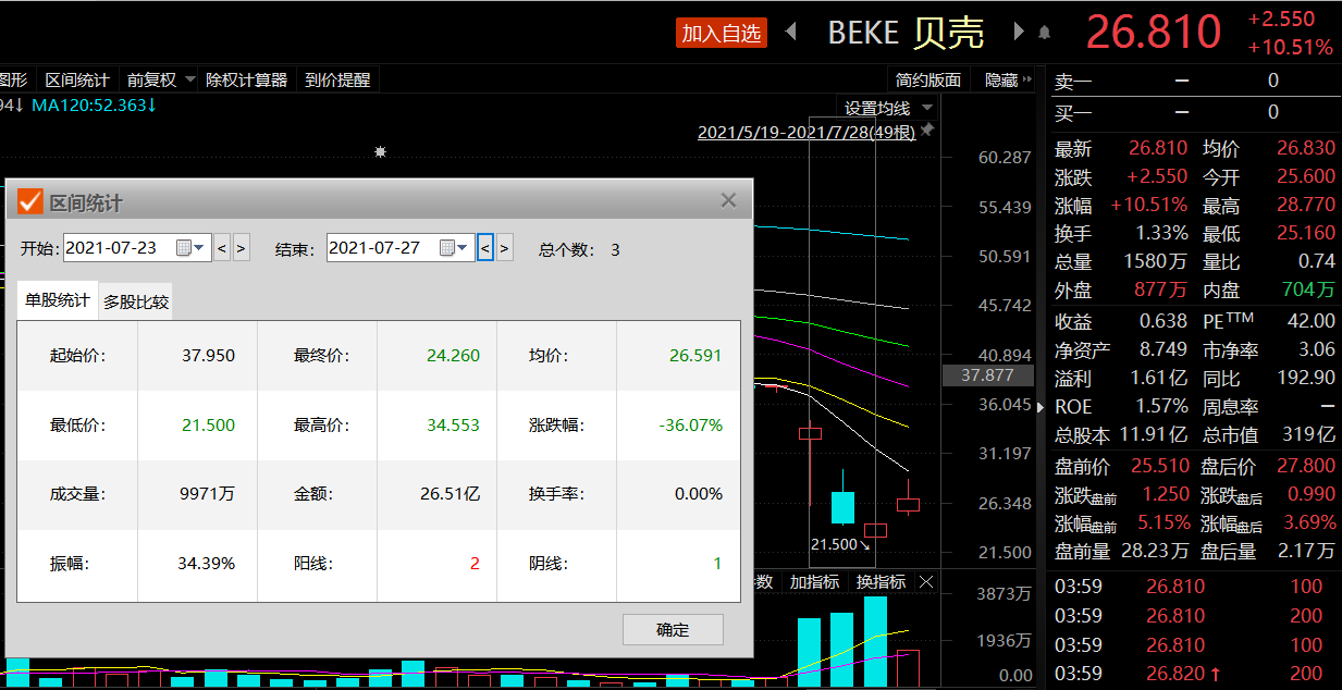 受此消息,中介公司贝壳的美股股价自上周五开启三连跌,截止7月27日(本周二)收盘,三日跌幅超36%。