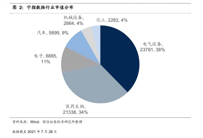 宁指数涉及的行业一共只有6个,市值高度分布在电气设备和医药生物两个行业,其中电气设备行业市值占指数总市值的比重高达 38%(7月28日股价),医药生物占比也有 34%,这两个行业加起来占了指数超过 70%的市值权重。宁指数其他涉及的行业还包括电子(市值占比 11%)、汽车(市 值占比 9%)、机械设备(市值占比 4%)、化工(市值占比 4%)。