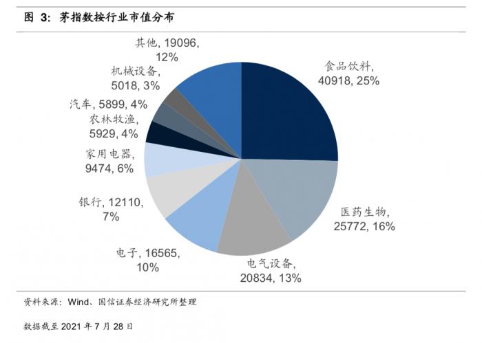 茅指数成分股较多涉及的行业也明显更多,一共涉及 16 个行业。其中市值占比最大的是食品饮料行业,占比达 25%, 这也是茅指数与宁指数构成中主要的区别,食品饮料行业在茅指数中是第一大行业,而在宁指数中却没有。