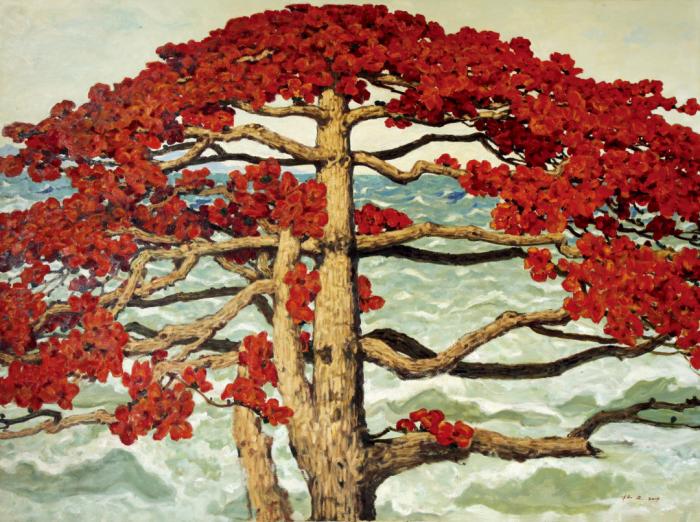 在建设国际一流湾区和世界级城市群宏伟目标的感召下,我在2019年创作了油画《湾区潮湧木棉红》(150×5000px)。如何用油画反映这一令人心潮澎湃的国家重大战略呢?我思绪万千,熟悉的珠三角、珠江口一幕幕景象浮现在我的脑海中,最后,我定格在象征着奋斗不息英雄的红棉树,它是珠三角大湾区人们熟悉的乔木。画面中的主体是一株异常高大、粗壮茂盛的红棉树,主干笔挺、叶落花开,红彤彤的花瓣鲜艳而厚实,轮生的枝干像千手佛有力地向四周展开。