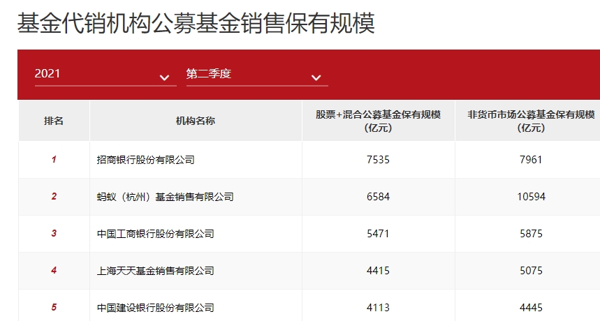 除蚂蚁基金和招商银行之外,工商银行、天天基金、中国银行、建设银行四家基金销售机构的非货币基金保有规模也超过了4000亿元。