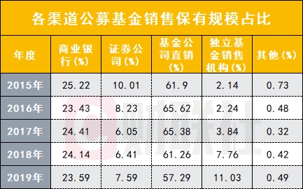 从2015年-2019年各渠道公募基金销售保有规模占比来看,银行、基金公司直销市场份额均有不同程度下降,证券公司占比维持稳定,而独立第三方机构占比则提升近9个百分点。由此可见,券商和互联网等其他第三方代销机构在短期内仍无法取代其地位,但未来有望持续抢占银行市场份额。