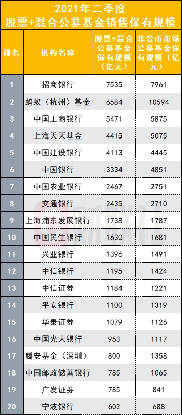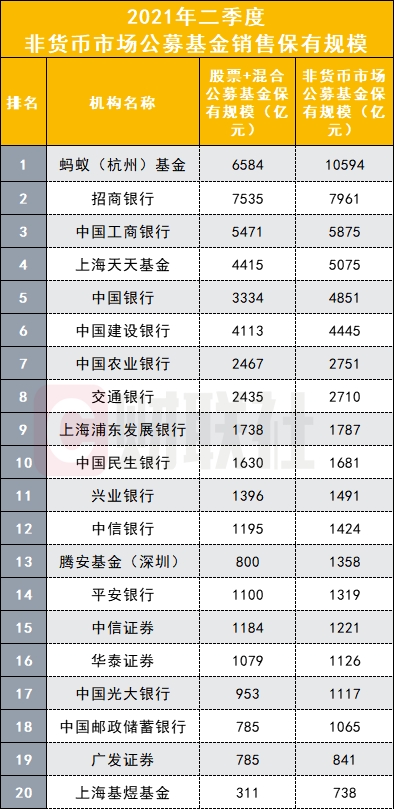 上述机构外,中国银行、中国建设银行二季度末的非货币市场公募基金保有规模也都在4000亿元以上。