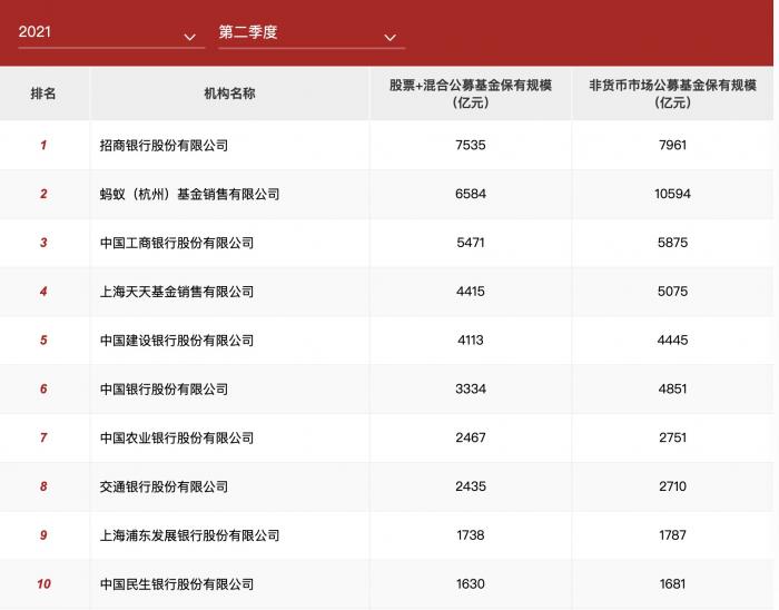 7月30日,中国证券投资基金业协会公示了2021年二季度销售机构非货公募基金销售保有规模情况。截至二季度末,招商银行在股票和混合型基金保有规模高达7535亿元,稳坐头把交椅。第三方机构蚂蚁基金非货币基金存量达到10594亿元,创造了基金代销机构非货基保有规模的新纪录,与第二名招商银行相比,领先优势扩大至2633亿元。