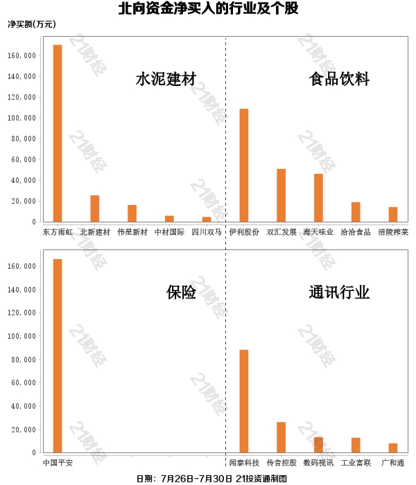 东方雨虹的中报业绩预告显示,产品销量实现增长,上半年业绩继续同增,预计增长35%—45%。北向资金对东方雨虹和中国平安的大幅买入,属于估值较低时进行抄底动作。东方雨虹在周二创下本轮调整以来的低点45.13元后,周三大幅流入11.72亿,该股当天涨停,周四、周五继续流入7.55亿、1.65亿。