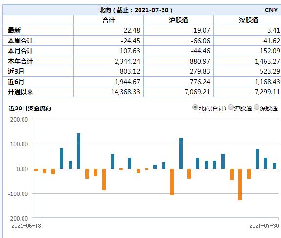 据21投资通(微信号ID:touzit21)智能监测,7月26-30日一周,北向资金合计净卖出24.45亿元,其中沪股通净卖出66.06亿元,深股通净买入41.62亿元,内部分化非常明显。