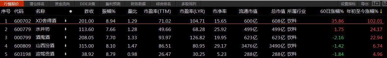 除了贵州茅台,其它白酒龙头表现也不好。五粮液(000858)、泸州老窖(000568)这2只白酒股今年以来跌幅达到23%以上。而实现上涨的只有少数业绩增长较快的公司,像山西汾酒、舍得酒业等。