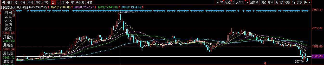 行情显示,从2月份涨到2608.59元高点后,贵州茅台开始下跌,现在已经跌到1678.99元。短短几个月时间,其跌幅达到35.6%,市值跌没了1.1万多亿,平均到14.63万股东身上每人亏损超过700万元。