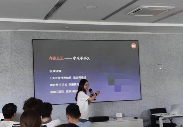 从网络上流传的内部方案会照片信息可以看到,小米手环X被称为“内卷之王”,配备了一块>360°的柔性卷轴屏幕,采用了无表带设计,即屏幕直接环绕手腕一周,实现360°屏幕显示。对此,王化在微博上说:“那个图是不是真的?是真的,绝对不是P的。这个产品是不是真的?很遗憾,绝对不是真的。这是小米内部新员工培训过程中的沙盘模拟演练,就一个虚拟产品的整体规划、卖点提炼、营销、公关、市场策略、渠道策略、上市规划、生命周期管理等方面分组进行作业。”