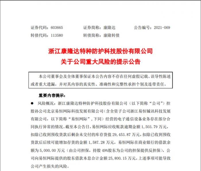 对上市公司的影响,公司公告表示,易恒网际电子通信设备业务的供应商、客户与公司及其他子公司主营业务的供应商、客户没有重叠。截止2021年7月31日,公司对易恒网际的权益账面值为-580.92万元,若易恒网际出现全部应收账款无法收回、全部存货无法变现等重大损失,易恒网际会出现无法偿还公司向其提供的股东借款本息合计25,800.15万元和银行借款担保损失5,000.00万元,若持股49%股东无任何财产为公司给易恒网际的借款提供担保和为公司给易恒网际的银行借款担保提供的反担保承担责任等极端情况,上述极端情况下,最终可能对公司的归母净利润造成的损失金额30,219.23万元,占上市公司最近一年经审计净资产的27.53%。上述业务风险事项若最终造成损失将对公司本期利润或期后利润产生不利影响。