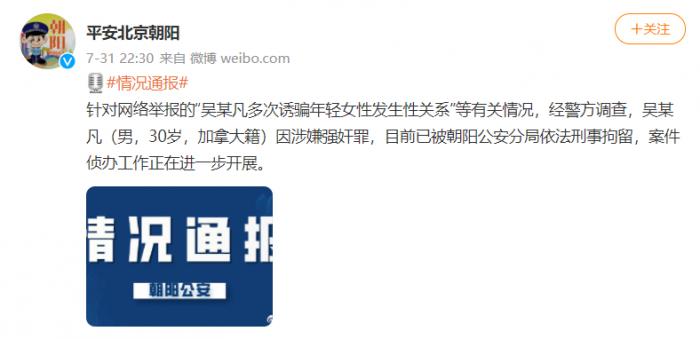 7月31日,平安北京朝阳微博晚间通报,针对网络举报的“吴某凡多次诱骗年轻女性发生性关系”等有关情况,经警方调查,吴某凡(男,30岁,加拿大籍)因涉嫌强奸罪,目前已被朝阳公安分局依法刑事拘留,案件侦办工作正在进一步开展。