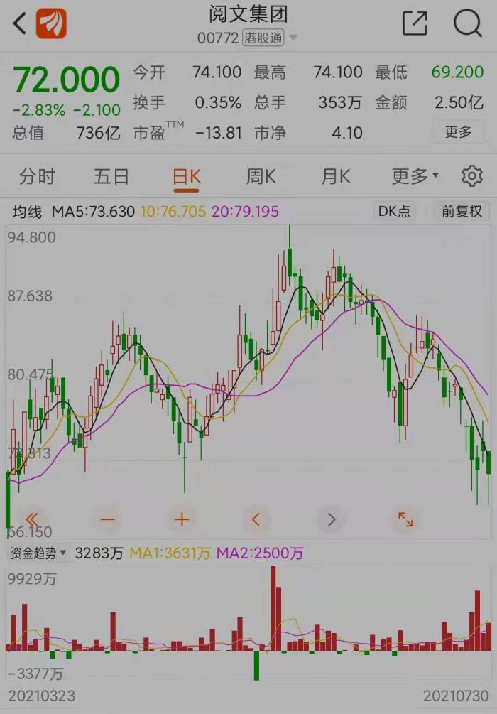 截至发稿, 阅文集团股价为72港元,自吴亦凡风波被爆出后,其股价就一路下跌,距离7月19日收盘价的81.45港元,已跌去13.12%。