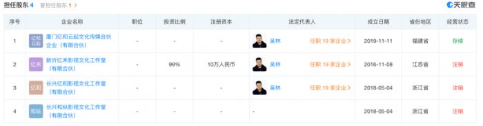 在担任股东的公司中,除了厦门亿和云起文化传媒合伙企业(有限合伙),其他三家也已注销。