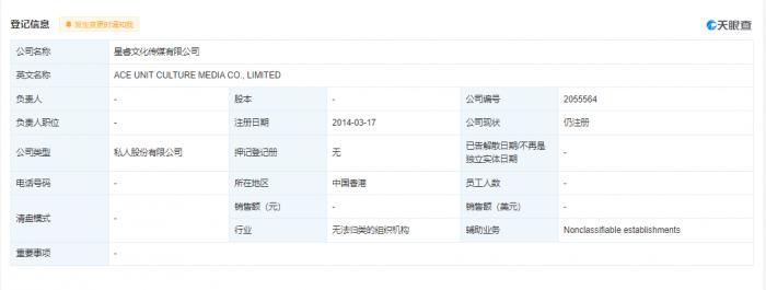 2018年,吴亦凡成立潮牌“A.C.E”, 据工商资料显示,A.C.E品牌的注册实体是天津星运文化发展有限公司,注册于2018年10月8日,法定代表人为孙小义,吴亦凡直接持股天津星运文化45%的股权,为最终受益人。