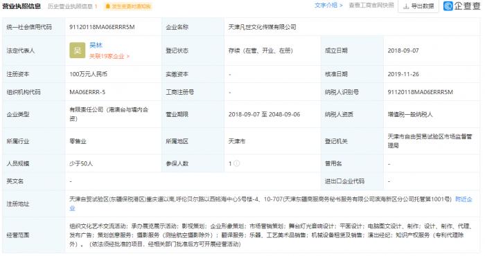 目前,吴亦凡的商业版图依然存在。据悉,目前吴亦凡背后的天津凡世文化传媒有限公司、星睿文化传媒有限公司等企业仍处于存续或仍注册状态。