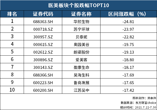 在此背景下,医美指数的跌幅也位居前列。7月22日至30日收盘,医美指数累计涨跌幅为-9.99%。