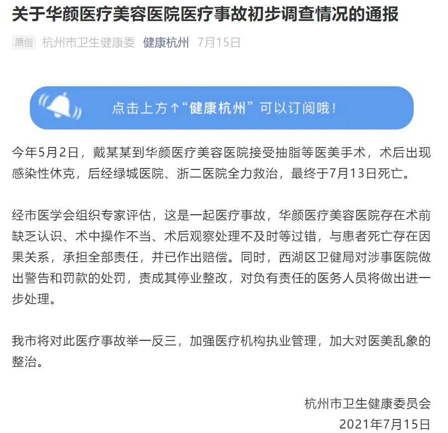 根据杭州卫健委于7月15日发布的通报,经杭州市医学会组织专家评估,这是一起医疗事故,华颜医疗美容医院存在术前缺乏认识、术中操作不当、术后观察处理不及时等过错,与患者死亡存在因果关系,承担全部责任,并已作出赔偿。同时,西湖区卫健局对涉事医院做出警告和罚款的处罚,责成其停业整改,对负有责任的医务人员将做出进一步处理。