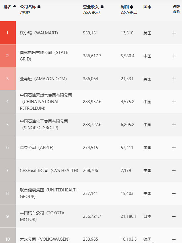 榜单第4名至第10名依次是中石油、中石化、苹果公司、CVSHealth、联合健康集团、丰田汽车、大众公司。