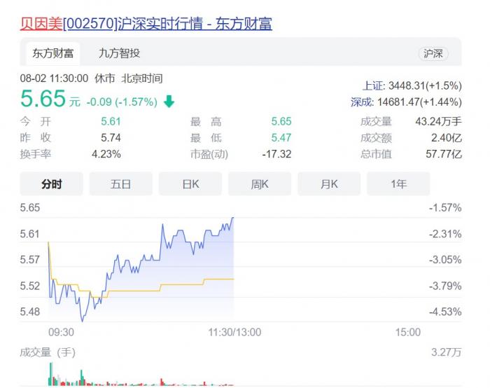 截至8月2日上午收盘,贝因美股价5.65元,下跌1.57%,公司总市值57.77亿元。
