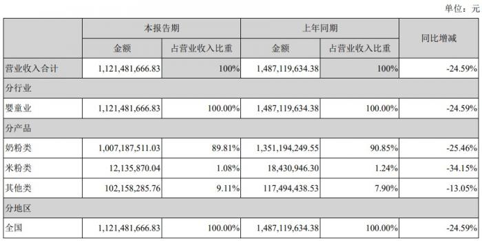 财报显示,今年上半年,贝因美奶粉产品收入约为10亿元,占总营收的89.81%,同比下降25.46%;米粉类产品上半年录得营收1213.58万元,占总营收的1.08%,同比下降34.15%。