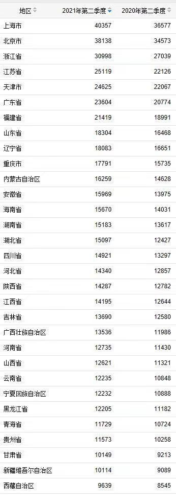 除了这三个省市,江苏、天津、广东、福建4省的人均可支配收入也都超过2万元。剩余24个省份中,除西藏外,上半年人均可支配收入均处在10000元-20000元区间。