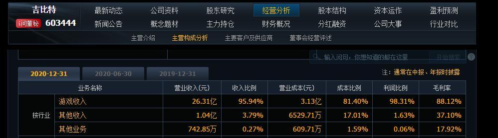 2020年财报显示,游戏收入占吉比特总营收比重高达95.94%,毛利率高达88.12%。