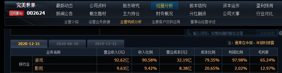 2020年财报显示,游戏收入占完美世界总营收比重高达90.58%,毛利率高达65.24%。