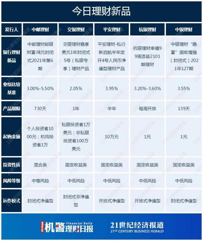 据南财理财通数据显示,近期,多家理财公司发售新品中,“中邮理财邮银财富·鸿远封闭式2021年第6期”业绩比较基准3.00%-5.50%,为混合类产品。该产品采用多资产复合投资策略,充分挖掘大类资产长期价值。在权益类资产投资方面,该产品通过参与优质企业优先股、定向增发等进行投资。