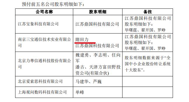 2019年5月15日,浩丰科技(300419.SZ)在《关于对浩丰科技的年报问询函》的回复中披露,公司前五家预付款公司中,包括隋田力控制的南京三宝通信技术实业有限公司(下称南京三宝通信)。