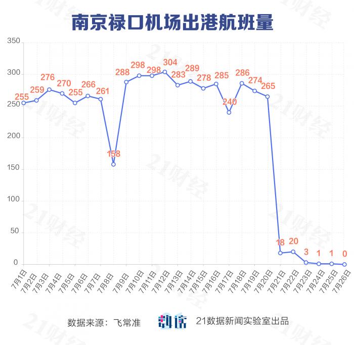 数据显示,7月26日已无客运航班起降。在7月30日举行的南京疫情防控发布会上,南京市交通运输局副局长郑春发透露,南京禄口机场国内、国际航线已先后暂停运营。