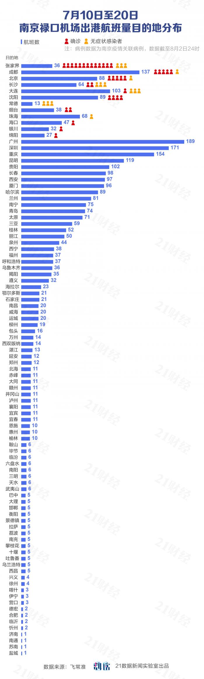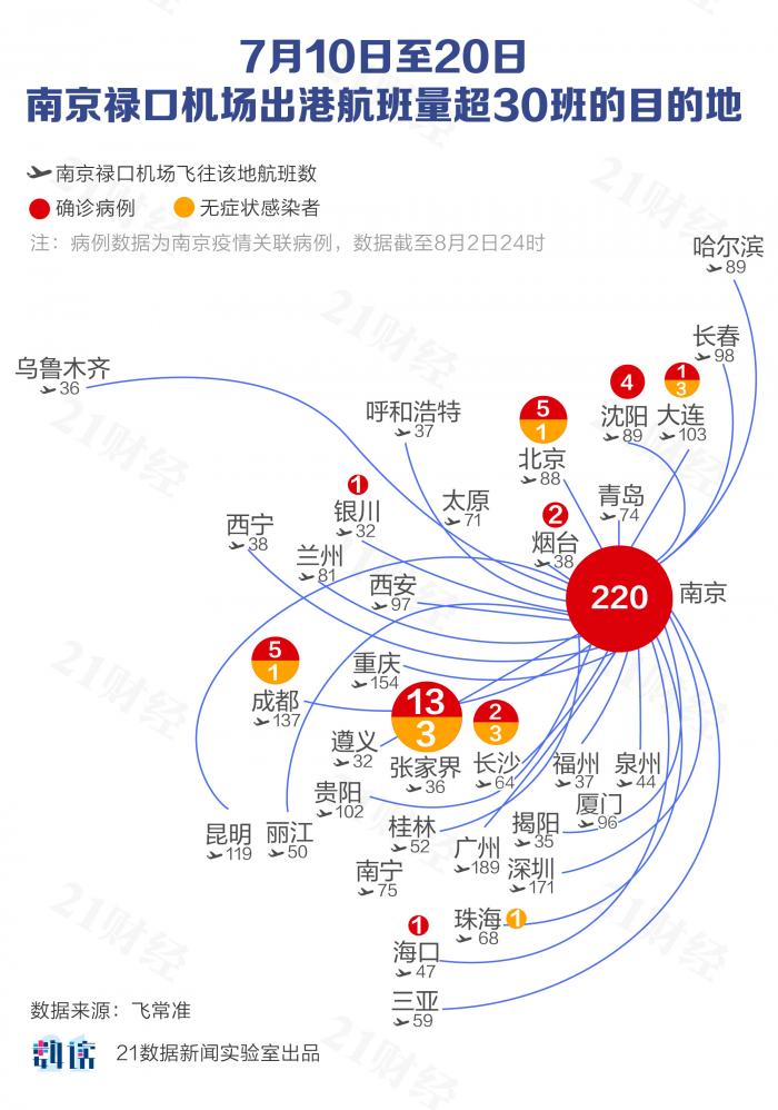 本轮南京疫情源头锁定7月10日的俄罗斯CA910入境航班。那么,7月10日到7月20日南京公布9份样品阳性期间,从南京禄口机场出发的航班都飞往哪些城市?大数据带你一看究竟。