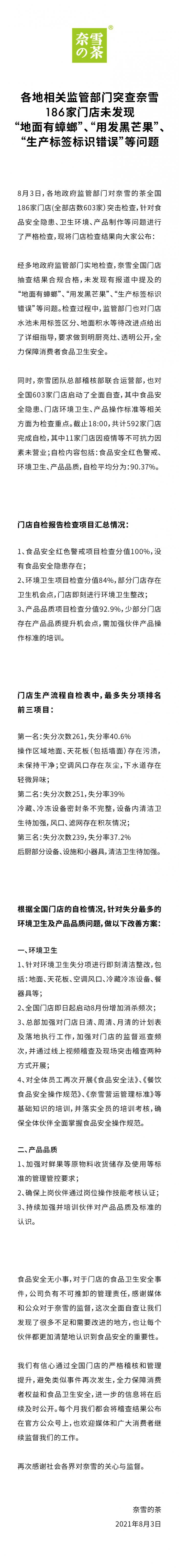 针对这一调查报道,8月3日凌晨5点,奈雪的茶官方微博回应称:公司管理层非常重视,第一时间成立了专项工作组,对涉事门店展开连夜彻查、整改。涉事的两家门店今天将暂停营业,同时会邀请市场监督管理局上门检查,并第一时间公布检查结果。